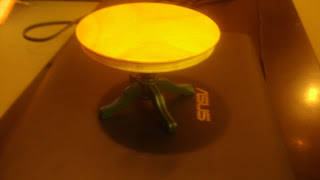 Sorry about the bad color of this picture. My camera keeps acting bad. The base on the table is the same Hunter Green as the house. I haven't found any chairs that I like yet. I like the size of this table. But, I think later down the road I would like to get a long table. I think it will fit better in the house.